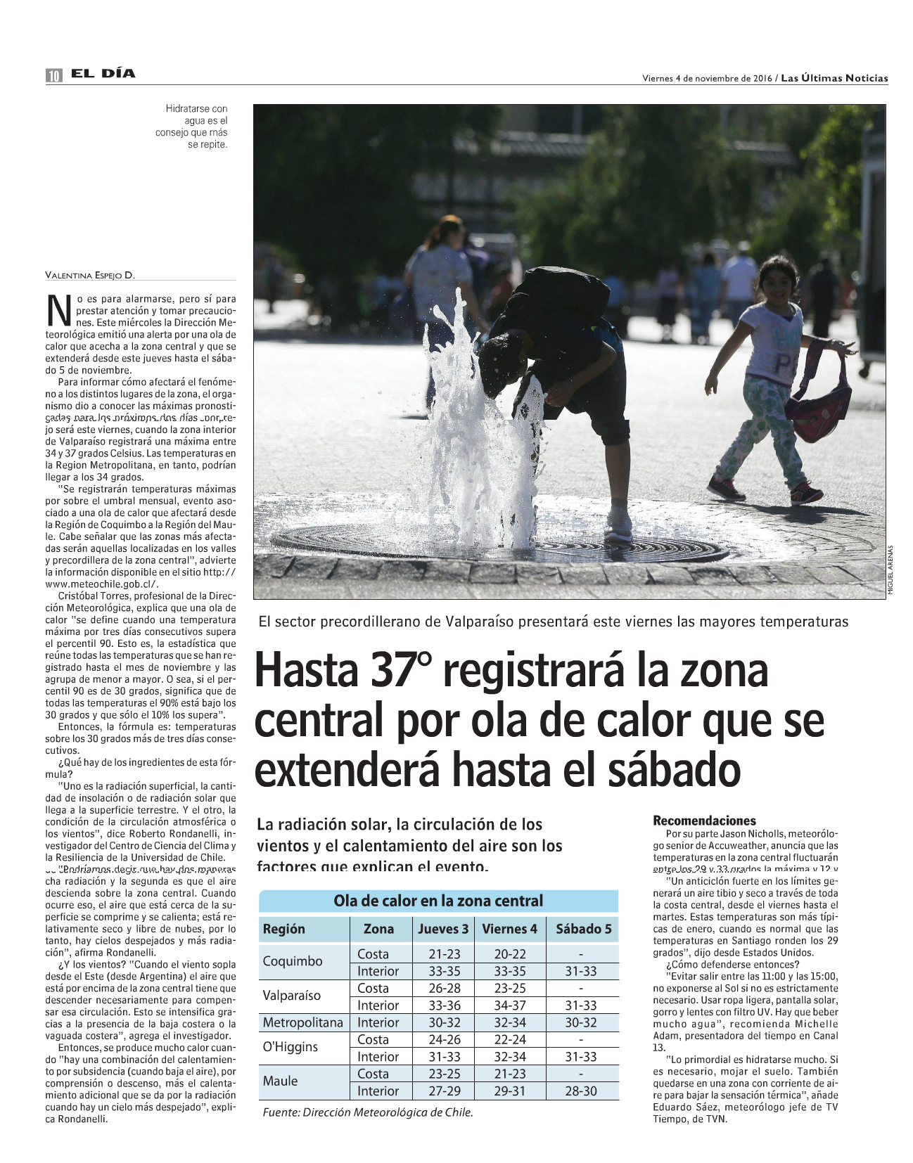 Para informar cómo afectará el fenómeno a los distintos lugares de la zona, el organismo dio a conocer las máximas pronosticadas para los próximos dos días, por región y sector (ver tabla). El día más complejo será este viernes, cuando la zona de Valparaíso registrará una máxima de 34 y 37 grados Celcius. Las temperaturas de la Región Metropolitana, en tanto, podrían llegar a los 34 grados.