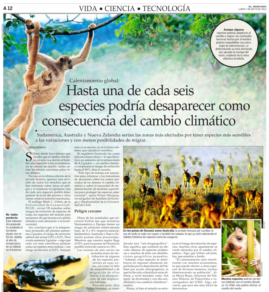(El Mercurio, 4 de mayo) Sudamérica, Australia y Nueva Zelandia serían las zonas más afectadas por tener especies más sensibles a las variaciones y con menos posibilidades de migrar.