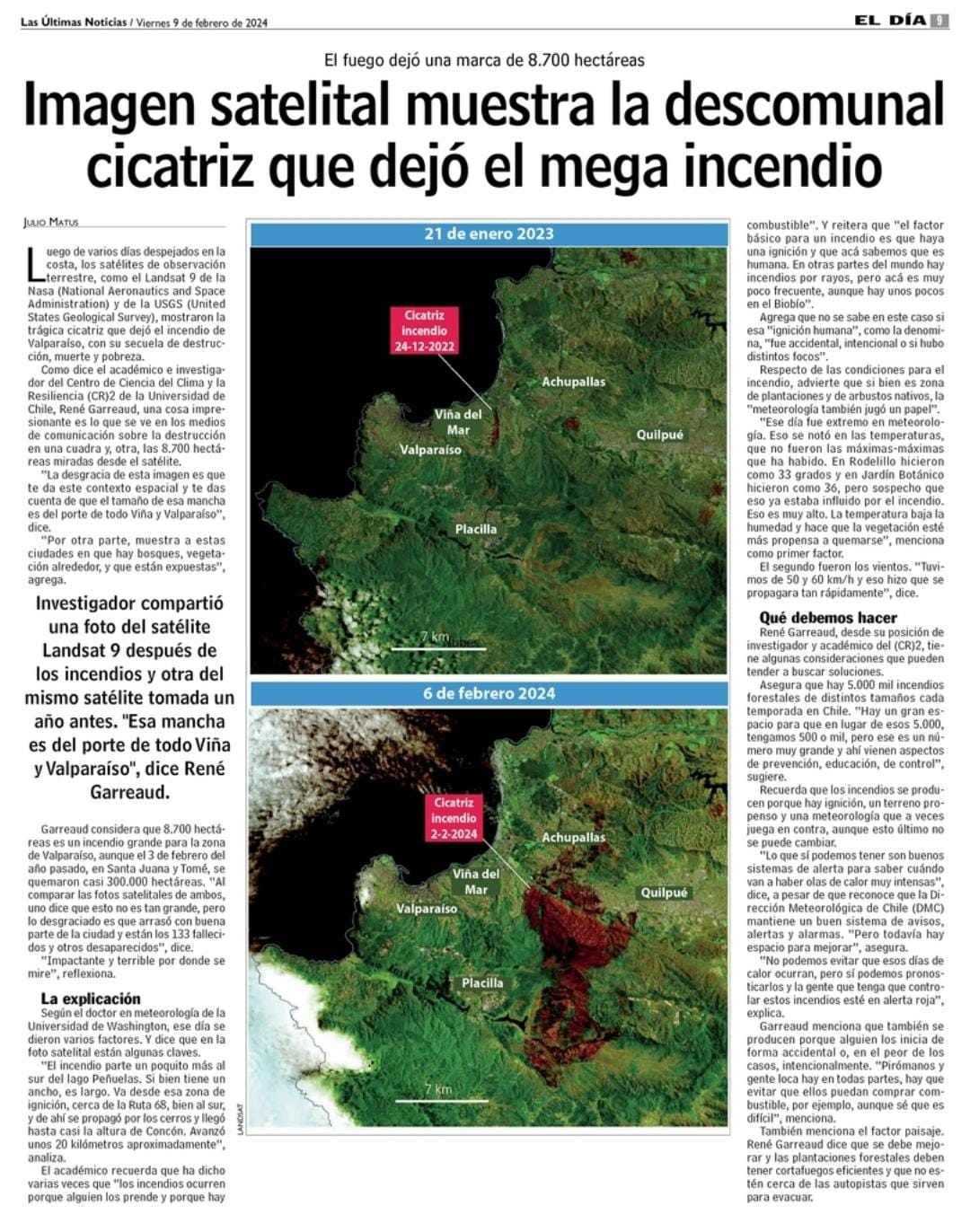 Agua y ExtremosIncendios forestalesMegasequía Imagen satelital muestra la descomunal cicatriz que dejó el mega incendio (Las Últimas Noticias) 9 de febrero de 2024 720 Leer en Las Últimas Noticias.