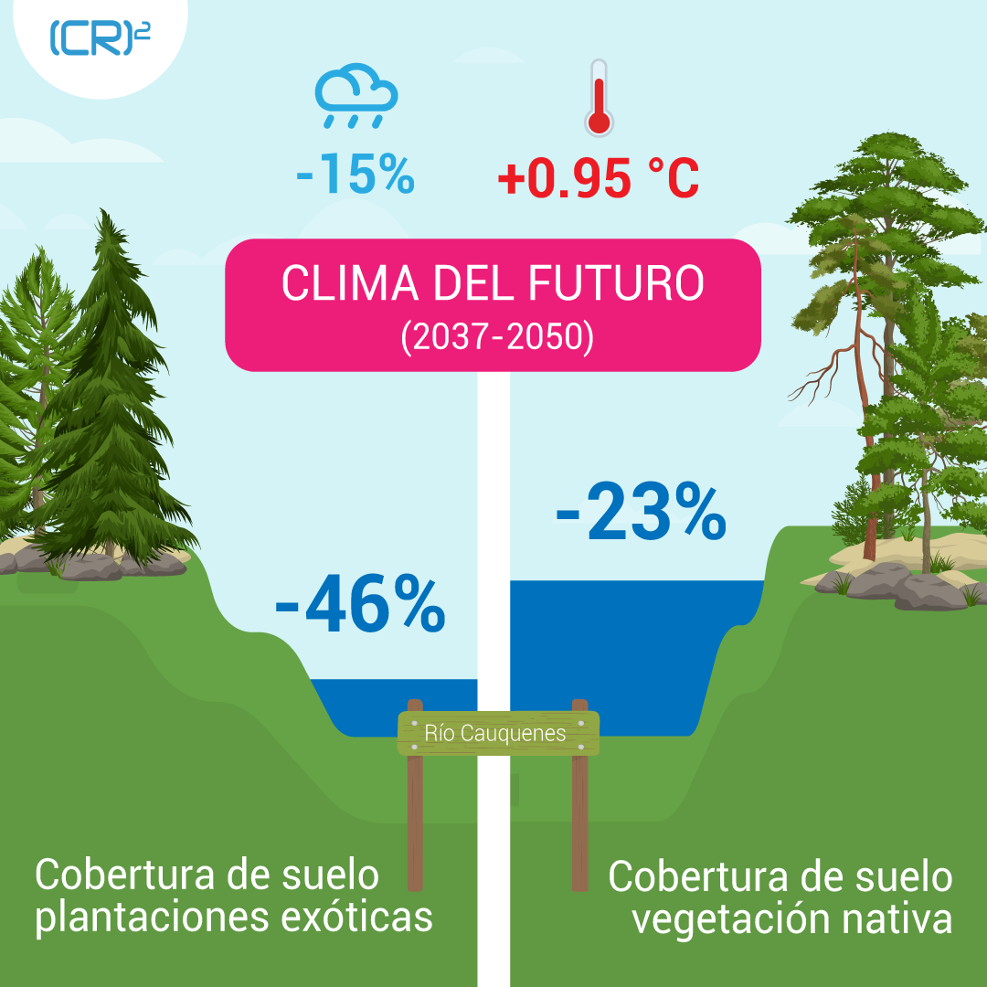 Combinando el cambio climático futuro y los escenarios con distintas coberturas de suelo, el caudal disminuiría, de acuerdo al promedio de los modelos considerados, entre un 23.3 % y un 46.2 %.