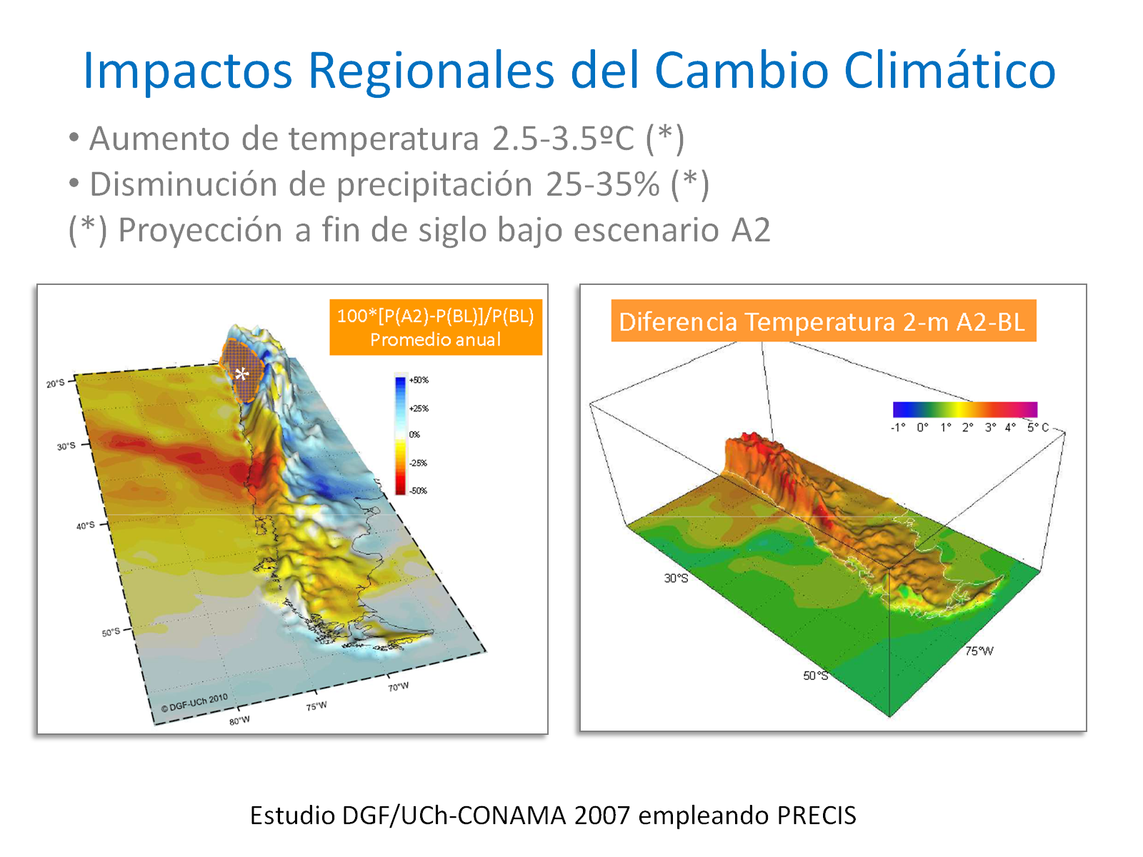 La disminución de precipitación en la zona centro y sur de Chile es posiblemente el impacto más negativo del cambio climático antrópico que enfrentará nuestro país a lo largo del siglo XXI (Figura 1a), al reducir la disponibilidad de agua dulce de la cual dependen la mayoría de las actividades humanas (e.g., Pino et al. 2015). El calentamiento superficial (Figura 1b) exacerba el déficit hídrico mediante el aumento de la pérdida de agua por evaporación (desde cuerpos de agua), evapotranspiración (desde cultivos) y sublimación (desde el manto nival). El aumento contemporáneo de temperaturas en la zona interior de Chile central ha sido firmemente constatada (Falvey & Garreaud 2009; Vuille et al. 2015), en tanto la actual megasequía (CR2, 2015) emerge como el primer evento en que el cambio climático tiene un rol discernible (Boisier et al. 2016).