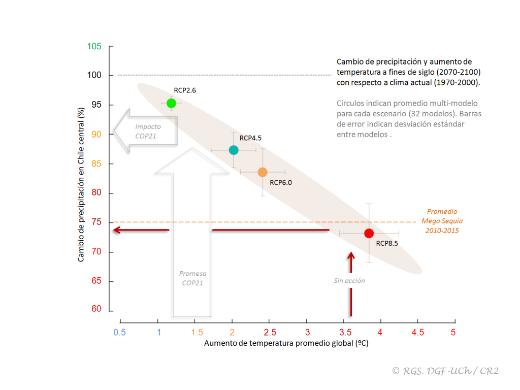 Como el escenario de emisiones de GEI determina también el aumento global de temperatura hacia fines de siglo, es posible establecer una relación empírica entre la intensidad del calentamiento global y el déficit de precipitación en Chile central, la cual resulta notablemente lineal (área sombreada en la Figura 2) y permite estimar el impacto regional de la COP21.