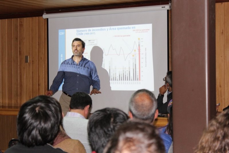 La jornada se inició con la exposición del Dr. Mauro González, investigador del (CR)2 y académico de la UACh, quien comenzó refiriéndose a la tormenta de fuego que afectó el país en la temporada de incendios 2016 – 2017, cuando distintos mega incendios afectaron simultáneamente tres regiones. Los incendios ocurridos -estiman- no tienen precedentes y lo comprueba la cifra de la superficie quemada entre el 18 de enero y el 5 de febrero de 2017: 468 mil hectáreas.