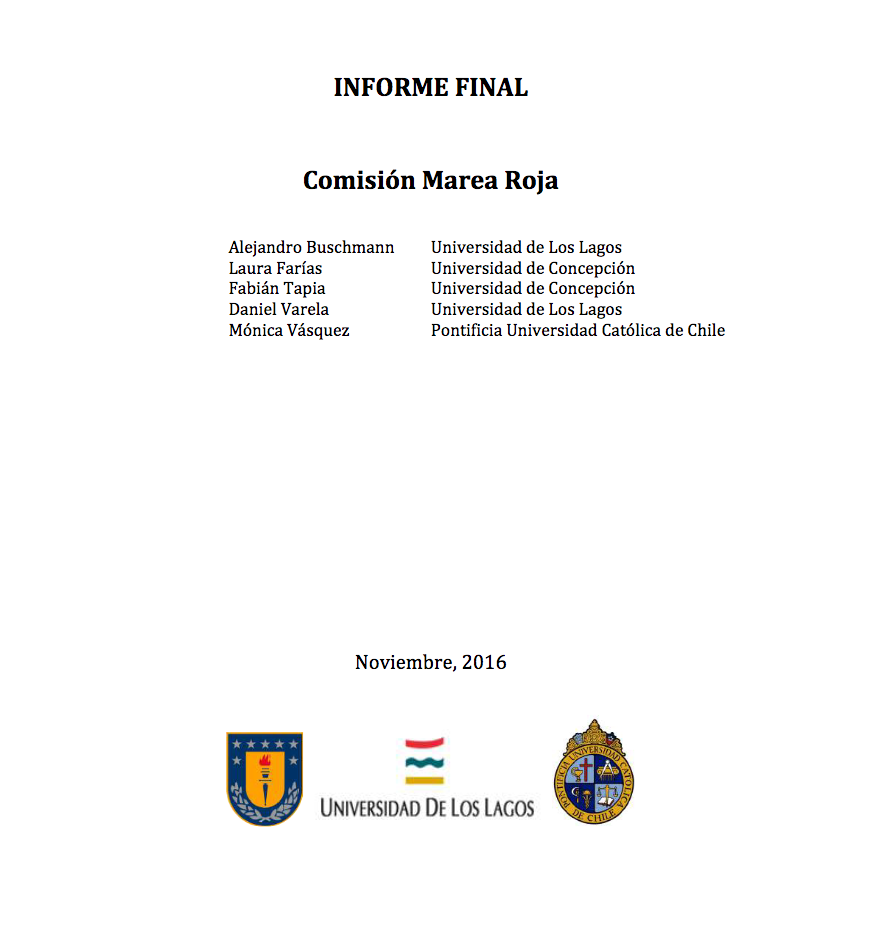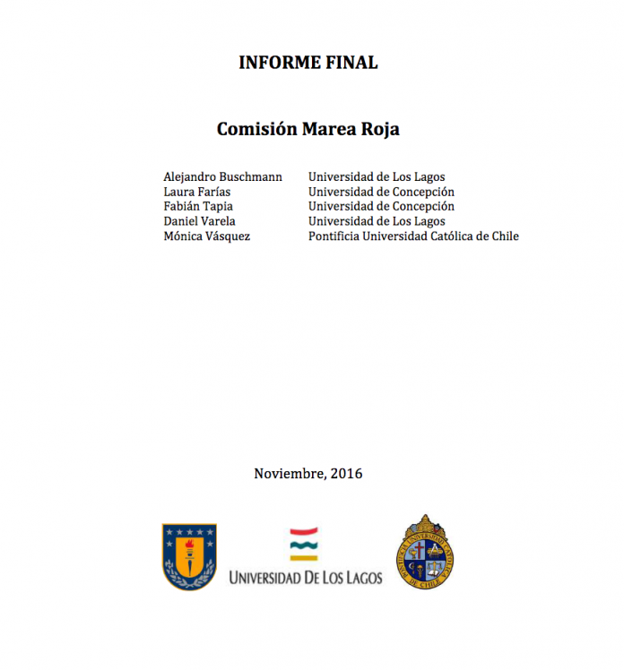 El documento elaborado el comité de científicos independientes convocados por el Ministerio de Economía para investigar el fenómeno de marea roja que afectó en el verano de 2016 a las regiones de Los Lagos y Aysén.