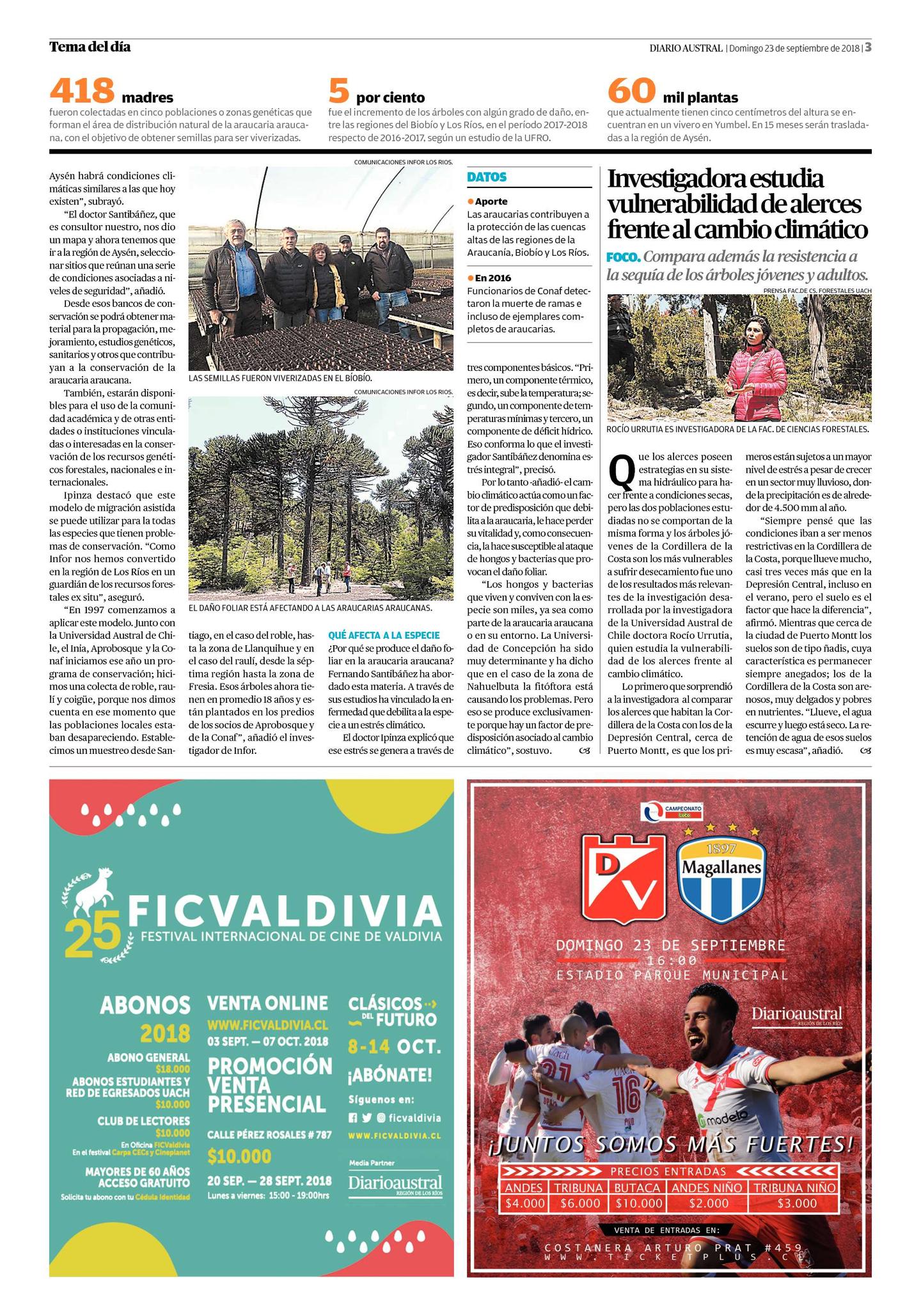 Que los alerces poseen estrategias en su sistema hidráulico para hacer frente a condiciones secas, pero las dos poblaciones estudiadas no se comportan de la misma forma y los árboles jóvenes de la Cordillera de la Costa son los más vulnerables a sufrir desecamiento fue uno de los resultados más relevantes de la investigación desarrollada por la investigadora de la Universidad Austral de Chile doctora Rocío Urrutia, quien estudia la vulnerabilidad de los alerces frente al cambio climático.