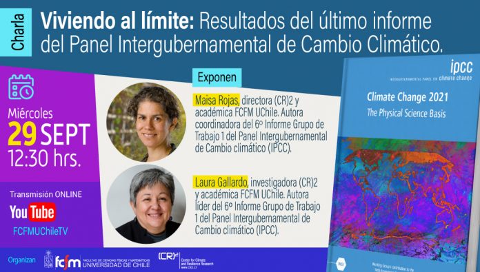 Como una forma de que la ciudadanía y, en especial, las y los futuros profesionales conozcan el panorama sobre calentamiento global que se vive actualmente y sus consecuencias a futuro, la Facultad de Ciencias Físicas y Matemáticas (FCFM) y el Centro del Clima y la Resiliencias, (CR)2, ambas de la Universidad de Chile, realizaron la charla “Viviendo al límite: resultados del último Informe del Panel Intergubernamental sobre Cambio Climático”, el que contó con la participación de Laura Gallardo, académica de la FCFM e investigadora del (CR)2, además de autora del grupo de trabajo I del IPCC; y la directora del (CR)2, académica FCFM y una de las autoras coordinadoras del informe del IPCC, del grupo de trabajo I, Maisa Rojas.