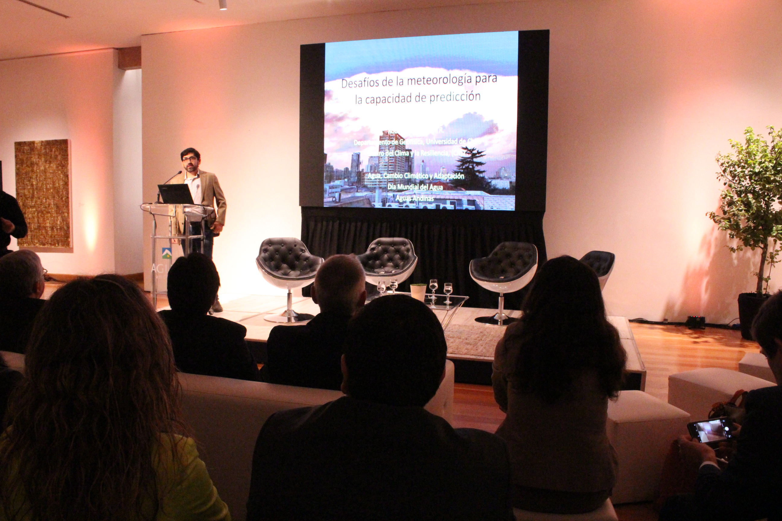 La jornada de celebración comenzó con la charla “Agua, Cambio Climático y Adaptación – Día Mundial del Agua 2017”, convocada por Aguas Andinas en el Museo de Artes Visuales (MAVI), en donde Roberto Rondanelli realizó la presentación “Desafíos de la Meteorología para la mitigación y capacidad de predicción”.