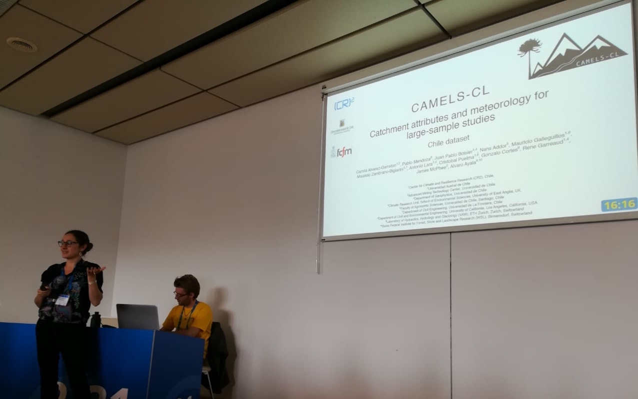 Camila Álvarez, investigadora postdoctoral de las líneas de Cambio de Uso de Suelo, y Agua y Extremos, presentó en la sesión “Large Sample Hidrology” la base de datos CAMELS-CL y un póster del producto grillado CR2MET elaborado por el investigador del (CR)2 Juan Pablo Boisier.