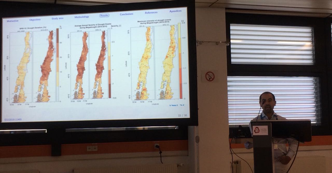 Mauricio Zambrano, investigador de la línea Agua y Eventos Extremos del (CR)2, presentó en la sesión “Droughts and Water Deficit” un análisis de la megasequía a nivel nacional en base a índices de precipitación y de evapotranspiración usando productos satelitales.