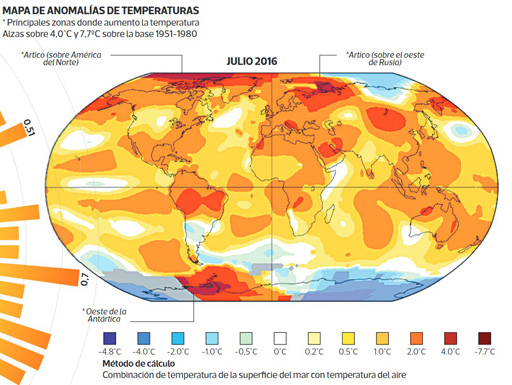 Como este mes es el más caluroso del año en el planeta (es verano en el hemisferio norte, zona que alberga la mayor cantidad de superficie de la Tierra), es también el mes más cálido en la historia, al menos en los últimos 250 mil años.