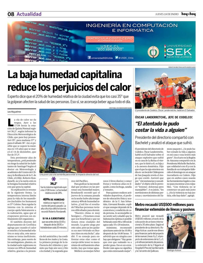 Esta persistente alza de temperatura, ¿está poniendo en riesgo la salud de los habitantes de Santiago? Según el doctor en Meteorología y académico del Centro de Ciencia del Clima y la Resiliencia de la U. de Chile, (CR)2, Roberto Rondanelli, no y la razón está en la benigna humedad relativa con que goza la capital.