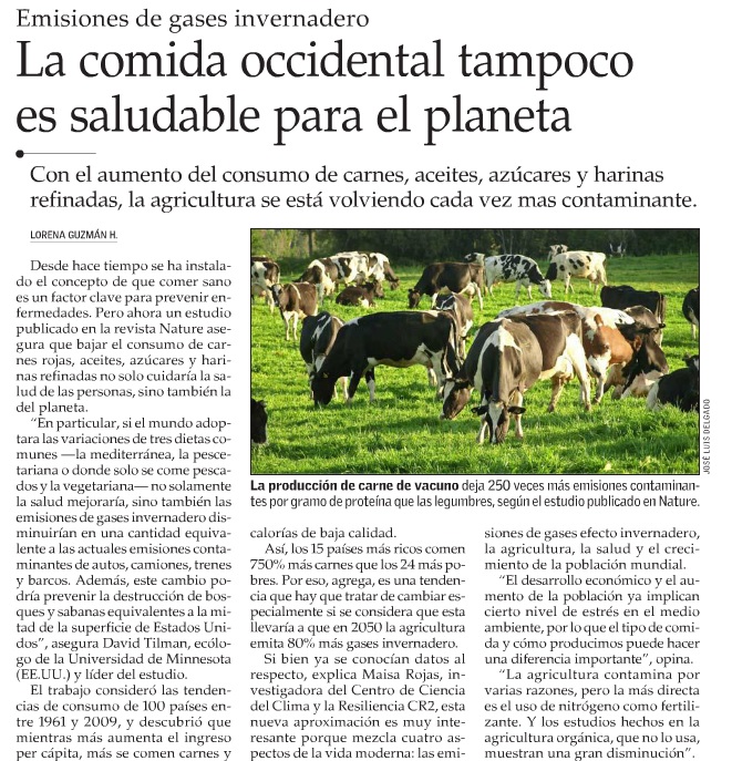 «En particular, si el mundo adoptara las variaciones de tres dietas comunes -la mediterránea, la pescetariana o donde solo se come pescados y la vegetariana- no solamente la salud mejoraría, sino también las emisiones de gases invernadero disminuirían en una cantidad equivalente a las actuales emisiones contaminantes de autos, camiones, trenes y barcos. Además, este cambio podría prevenir la destrucción de bosques y sabanas equivalentes a la mitad de la superficie de Estados Unidos», asegura David Tilman, ecólogo de la Universidad de Minnesota (EE.UU.) y líder del estudio.