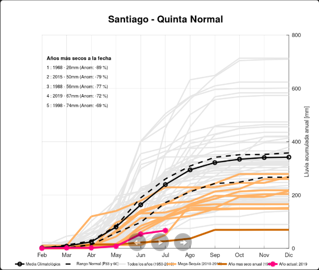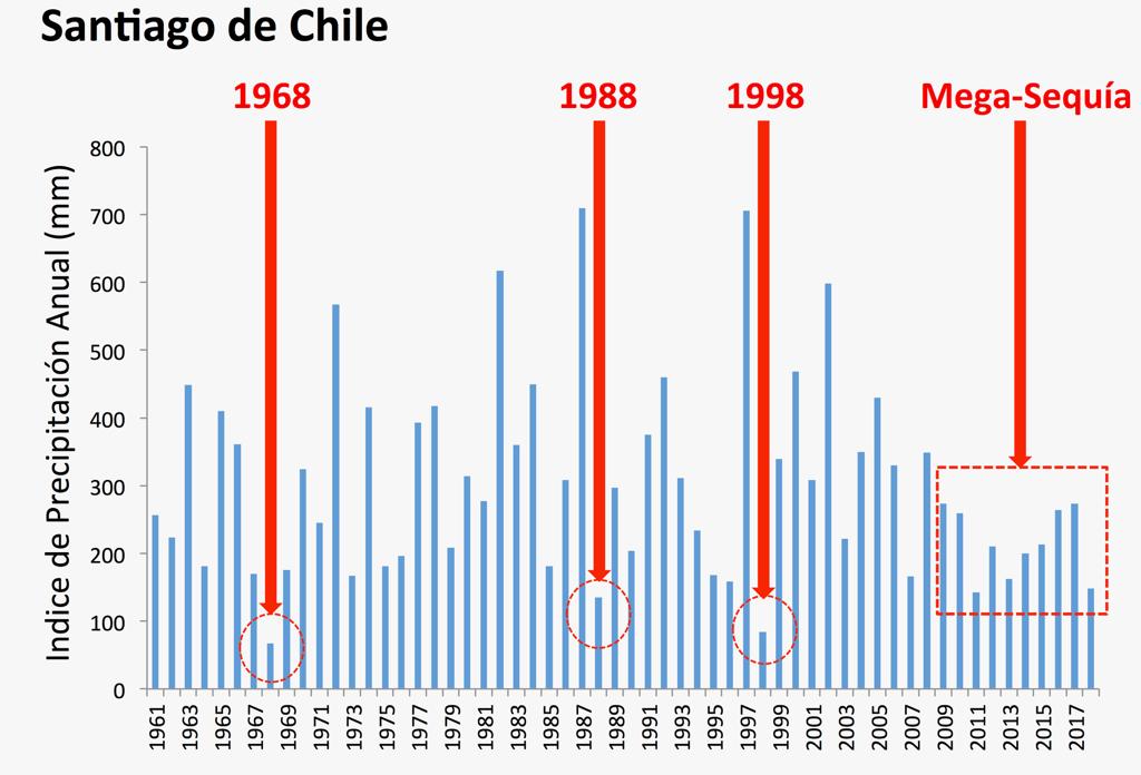 Es un evento comparable con sequías históricas que afectaron a la zona central en 1924 y 1968. Para Cordero, resulta llamativo el hecho de que ni siquiera los recientes fenómenos de El Niño (incluido este año) hayan podido cortar una racha de 10 años con precipitaciones bajo el promedio de largo plazo.