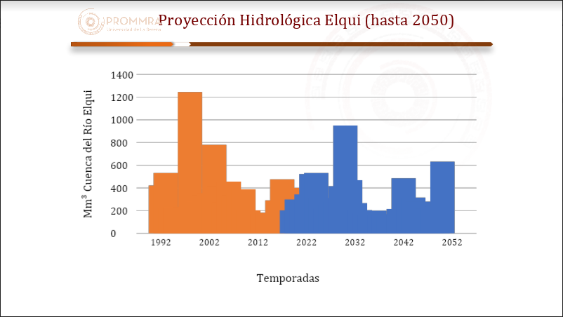 Para el año 2050, el agua disponible en Chile se reducirá en un tercio en algunas regiones, según los modelos actuales, lo que extenderá los periodos de riesgo que se aplican hoy y se reducirán los cultivos más intensivos en agua, especialmente aquellos sin acceso a mejoras tecnológicas, según explicó el director del laboratorio PROMMRA del Departamento de Agronomía de la Universidad de La Serena, Pablo Álvarez.