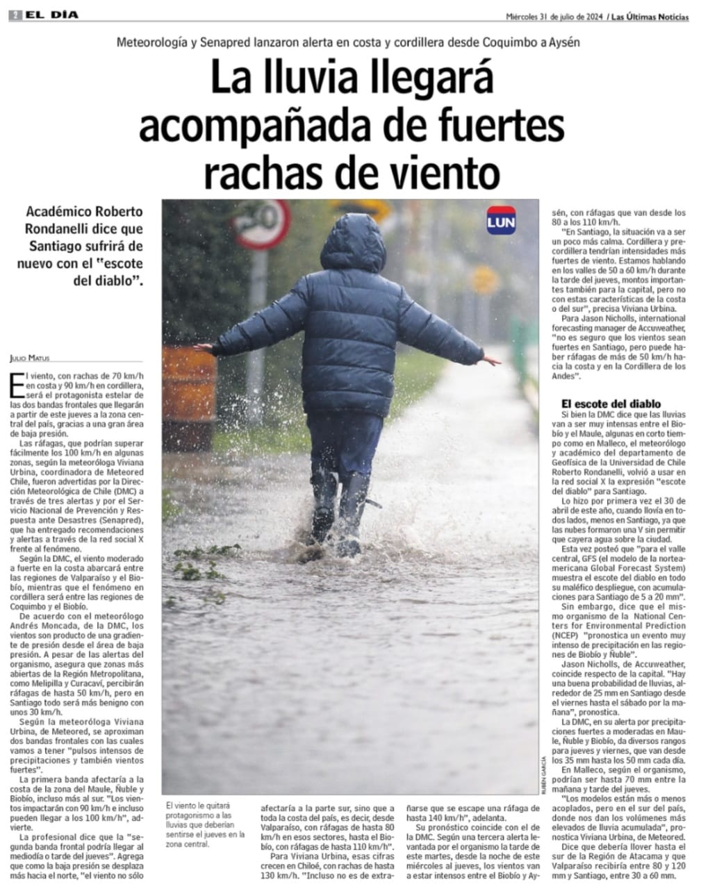 Agua y Extremos La lluvia llegará acompañada de fuertes rachas de viento (LUN) 31 de julio de 2024 517 Académico Roberto Rondanelli dice que Santiago sufrirá nuevo «escote del diablo». Leer en LUN.