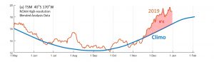 Figura 1: Evolución de la temperatura superficial del mar (TSM) en el océano Pacífico Sur Occidental (40° S 170° W) desde el 1 de mayo al 31 de diciembre de 2019 (curva roja). Para referencia la curva azul indica el promedio histórico de la TSM en esa zona. Fuente: NOAA-Análisis combinado de alta resolución.