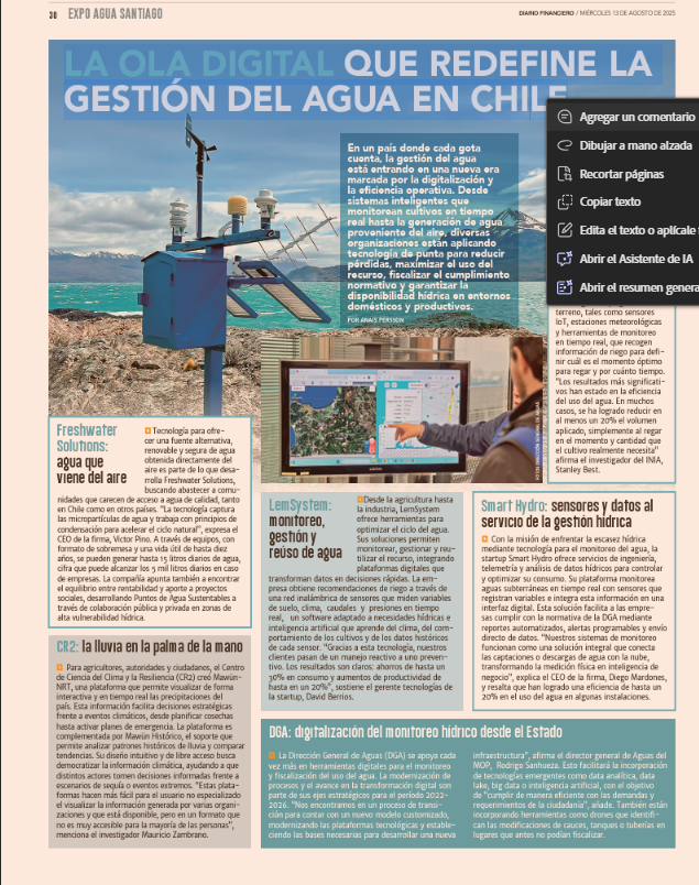 La ola digital que redefine la gestión del agua en Chile (El Financiero) 13 de agosto de 2025 808 Leer en El Financiero