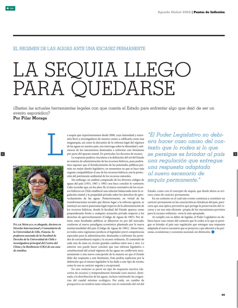 «La sequía llegó para quedarse» por Pilar Moraga 21 de enero de 2016 2078 Columna de opinión publicada en «Puntos de Inflexión 2016», especial editado por La Segunda y The New York Times.
