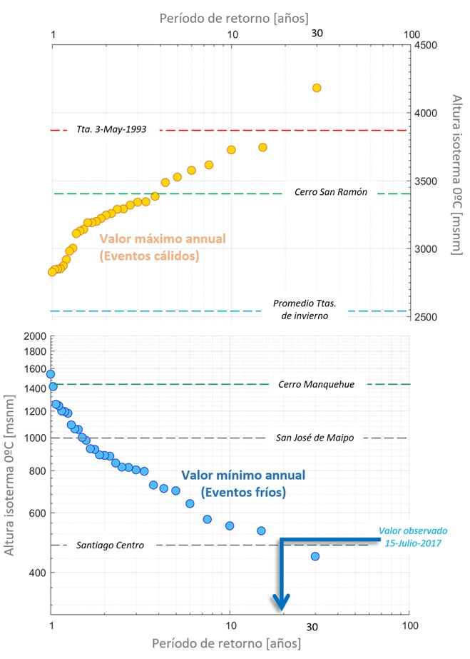 La figura adjunta también incluye el periodo de retorno de H0 considerando eventos cálidos (panel superior). El valor medio de H0 en tormentas de invierno es unos 2500 msnm y naturalmente todos los años ocurre al menos una tormenta con H0 por encima de este valor. En promedio, solo una vez cada 7 años ocurre una tormenta lo suficientemente cálida como para que llueva hasta la cumbre del cerro San Ramón frente a Santiago (3500 msnm), y la altura de H0 en la tormenta de Mayo de 1993 tiene una recurrencia cercana a los 25 años, desencadenando aluviones en la precordillera de Santiago con dramáticas consecuencias (e.g., Garreaud & Rutllant 1997).