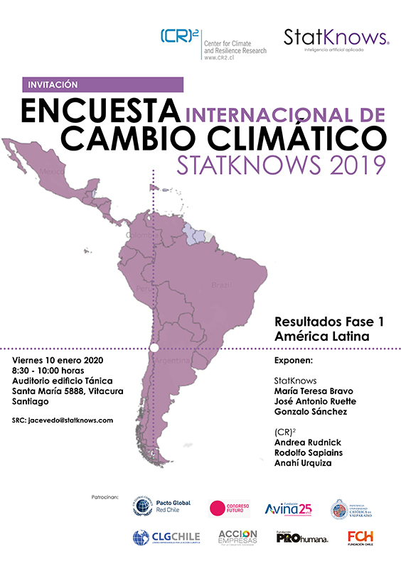 StatKnows y el Centro de Ciencia del Clima y la Resiliencia (CR)2 invita al lanzamiento de los resultados de la Encuesta Internacional de Cambio Climático realizada por StatKnows y el Centro de Ciencia del Clima y la Resiliencia (CR)2. La encuesta fue aplicada en 18 países de América Latina y El Caribe a 7.232 personas durante noviembre de 2019. Los hallazgos fueron presentados en un evento oficial de la COP25, llevada a cabo en Madrid en diciembre recién pasado.