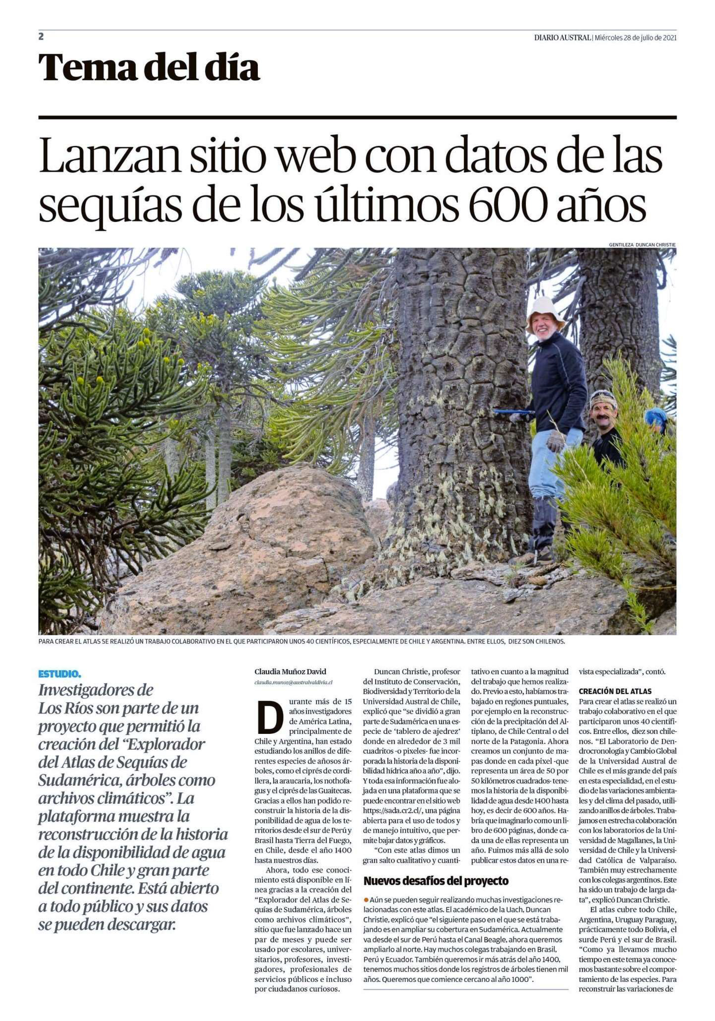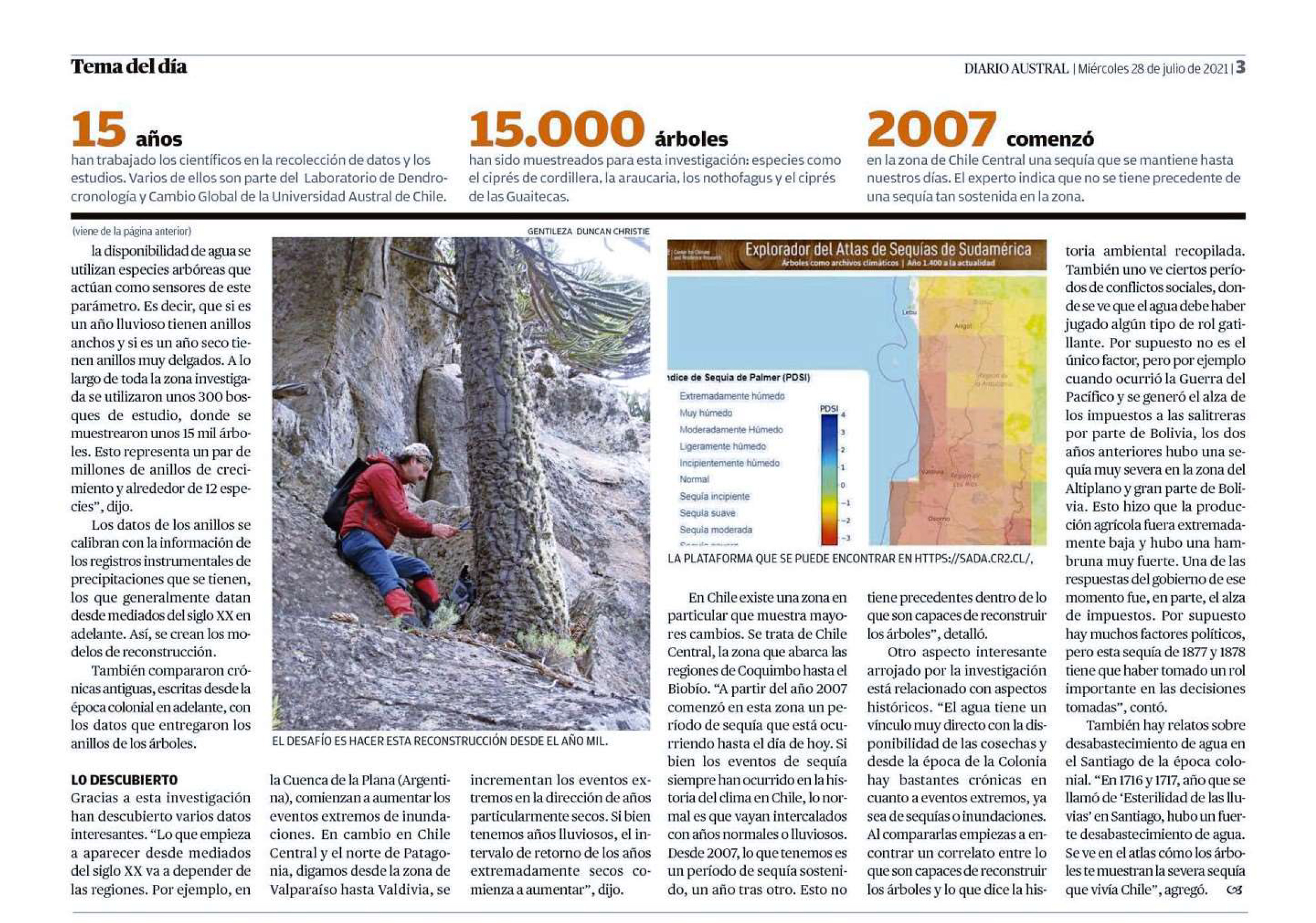 Investigadores de Los Ríos son parte de un proyecto que permitió la creación del «Explorador del Atlas de Sequías de Sudamérica, árboles como archivos climáticos». La plataforma muestra la reconstrucción de la historia de la disponibilidad de agua en todo Chile y gran parte del continente. Está abierto a todo público y sus datos se pueden descargar.