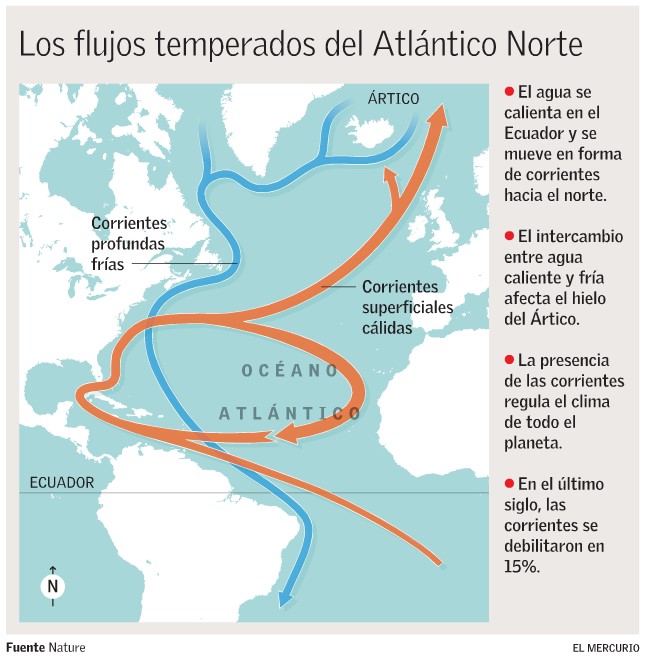 El intercambio de agua fría y dulce que generan las corrientes del Atlántico norte afecta el clima planetario. Pensado en grandes escalas de tiempo, es responsable de las glaciaciones. En cambio, cuando se habla de décadas, las consecuencias no son tan extremas, aseguran dos trabajos publicados en la última edición de Nature, pero sí pueden potenciar el cambio climático.