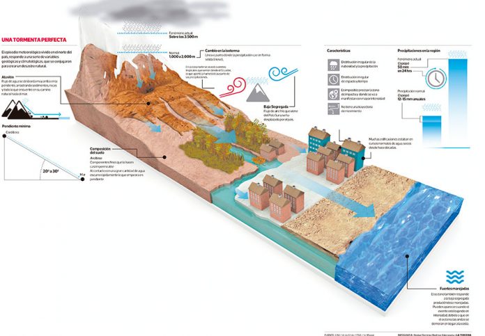 René Contreras, experto en mecánica de fluidos de la U. de Mayor, explica que los suelos del norte son arcillosos y tienen mucho componente fino. “Eso lo hace prácticamente impermeable, es tan fino que parece talco, le llamamos chusca. El comportamiento que tiene cuando hay aporte de agua es que ésta no se infiltra y escurre superficialmente, agrandando el fenómeno la pendiente que existe de cordillera a mar”.
