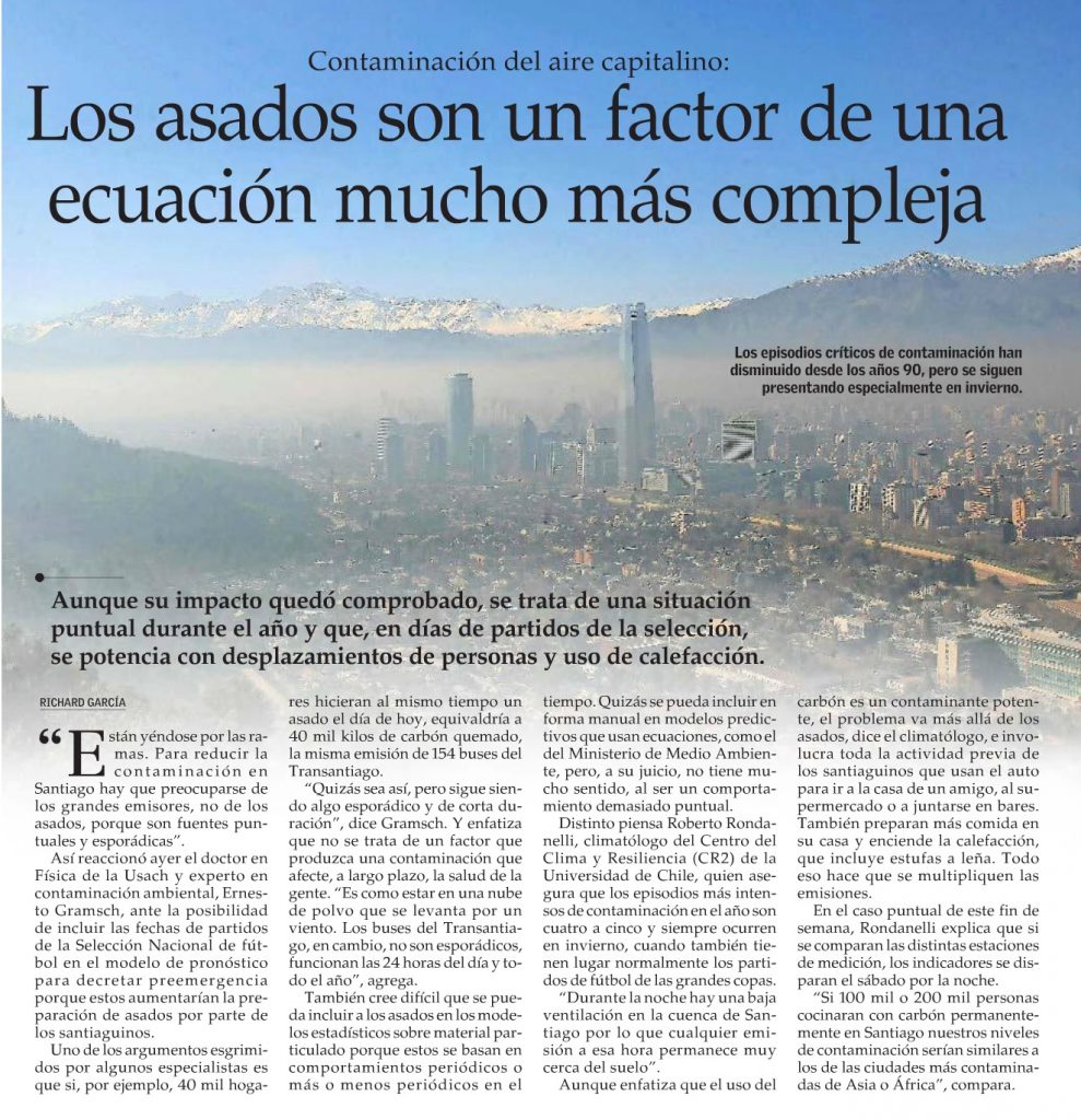 Así reaccionó ayer el doctor en Física de la Usach y experto en contaminación ambiental, Ernesto Gramsch, ante la posibilidad de incluir las fechas de partidos de la Selección Nacional de fútbol en el modelo de pronóstico para decretar preemergencia porque estos aumentarían la preparación de asados por parte de los santiaguinos.