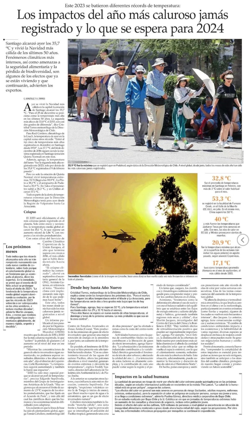 Santiago alcanzó ayer los 35,7°C y vivió la Navidad más cálida de los últimos 50 años. Fenómenos climáticos más intensos, así como amenazas a la seguridad alimentaria y la pérdida de biodiversidad, son algunos de los efectos que ya se están viviendo y que continuarán, advierten los expertos.