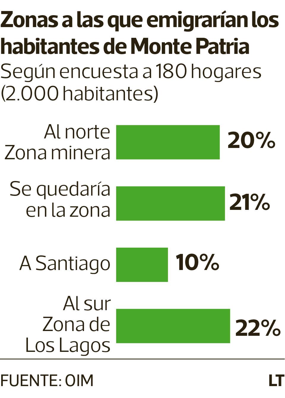 Según una encuesta realizada por la OIM a 180 hogares pertenecientes a los sectores más afectados por la sequía en Monte Patria, el 49,5% de los habitantes estaría dispuesto a desplazarse a otras partes del país con mejores oportunidades de empleo y disponibilidad de recurso hídrico. Solo el 21% se quedaría en la zona (ver infografía).
