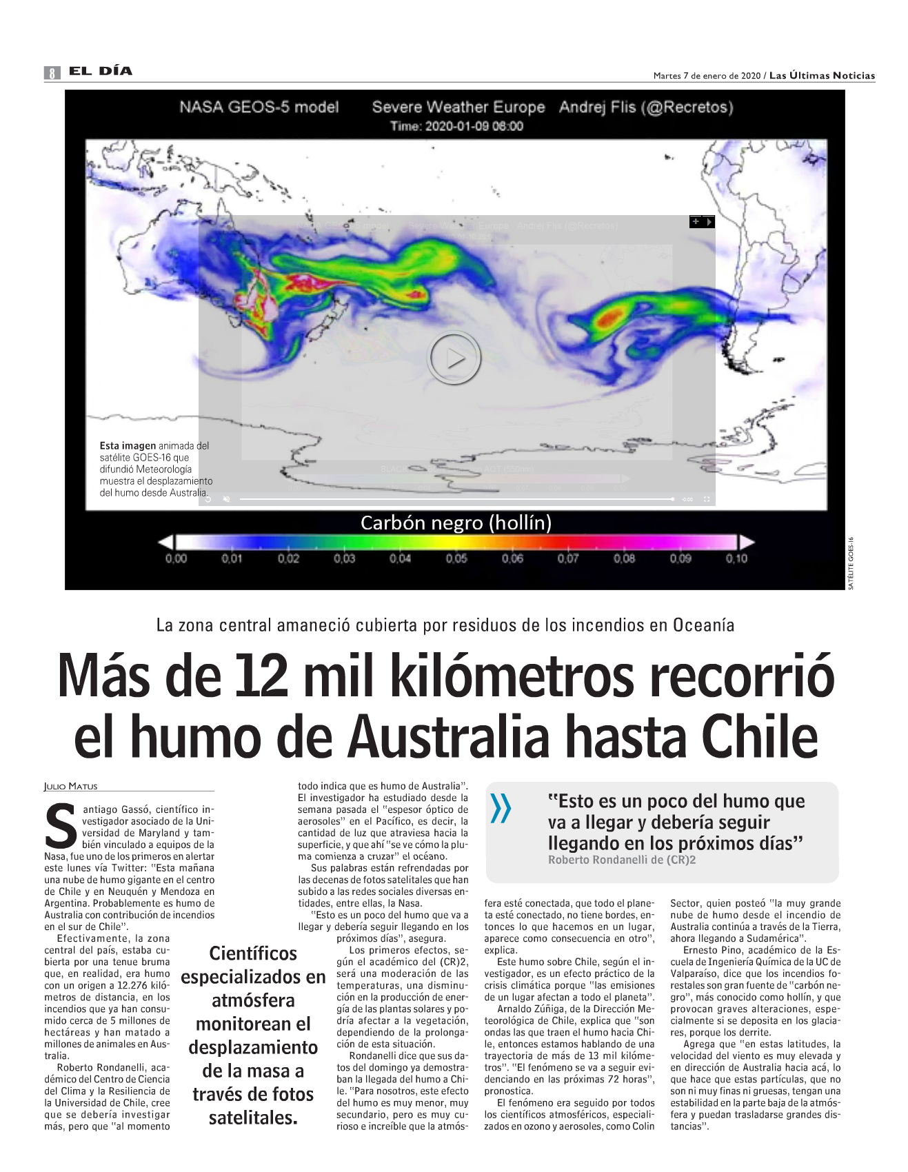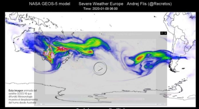 Santiago Gassó, científico investigador de asociado de la Universidad de Maryland y también vinculado a equipos de la Nasa, fue uno de los primeros en alertar este lunes vía Twitter: » Esta mañana una nube de humo gigante en el centro de Chile y en Neuquén y Mendoza en Argentina. Probablemente es humo de Australia con contribución de incendios en el sur de Chile».