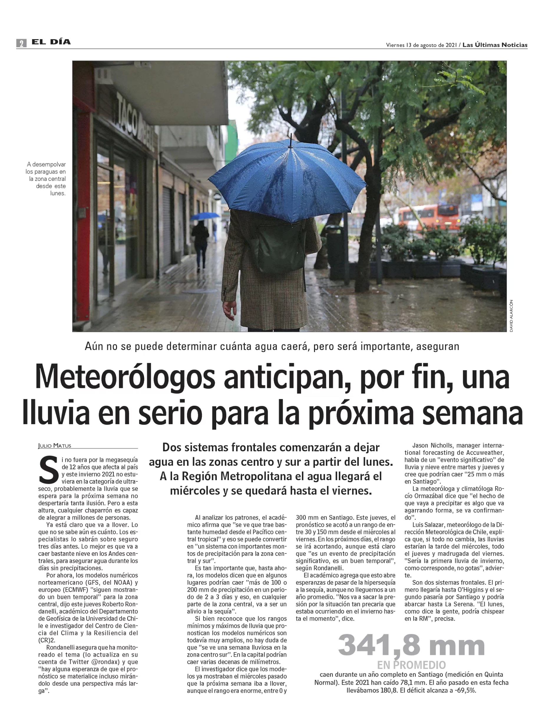 Si no fuera por la megasequía de 12 años que afecta al país y este invierno 2021 no estuviera en la categoría de ultraseco, probablemente la lluvia que se espera para la próxima semana no despertaría tanta ilusión. Pero a esta altura, cualquier chaparrón es capaz de alegrar a millones de personas.
