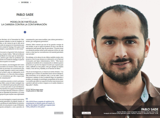 Pablo Saide, Ingeniero Mecánico de la Universidad de Chile, comenta que fue mientras realizaba su tesis de magíster, en la misma casa de estudios, se dio cuenta de que lo suyo era la investigación. «Usé un modelo de transporte de contaminantes para verificar las emisiones de la ciudad de Santiago. Pero quise ir más allá y decidí partir al extranjero a especializarme en estos temas».