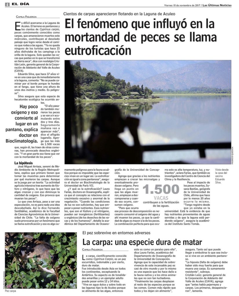 Zona costera Mortandad de peces en Laguna de Aculeo: el fenómeno que influyó se llama eutroficación (Las Últimas Noticias) 10 de noviembre de 2017 3151 Leer en Las Últimas Noticias