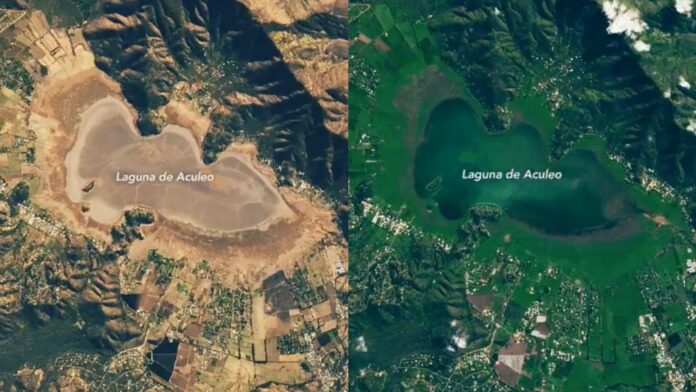 Este miércoles, la Administración Nacional de Aeronáutica y el Espacio, mayormente conocida como la NASA, realizó una publicación en la que expuso dos imágenes comparando el antes y el después de la laguna Aculeo en Chile tras el paso del sistema frontal que afectó a la zona centro-sur del país.