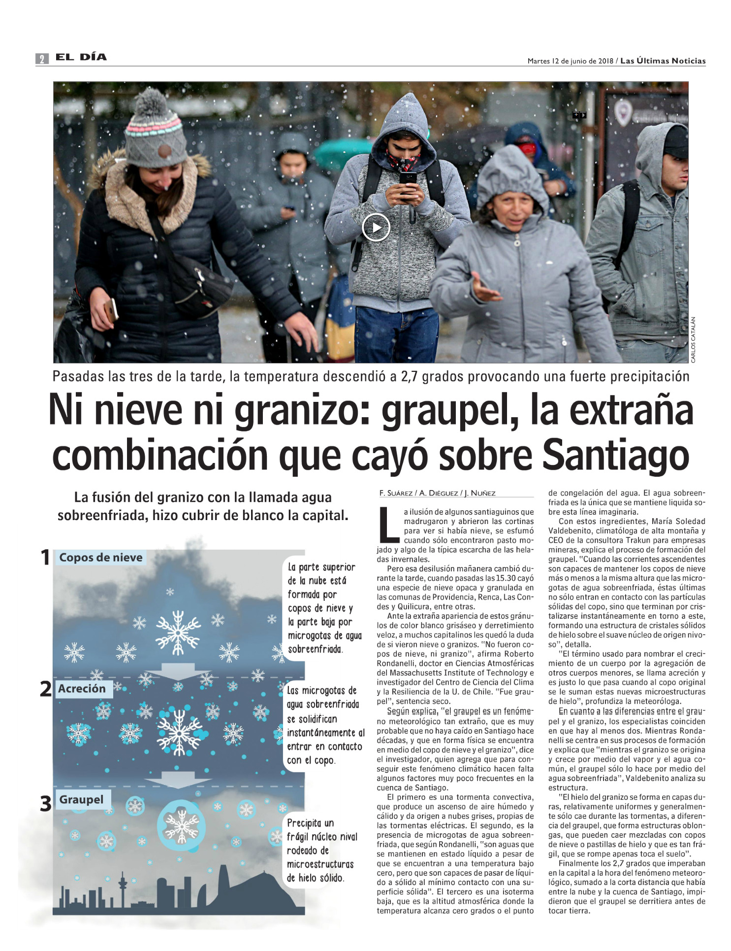 Ante la extraña apariencia de estos gránulos de color blanco grisáceo y derretimiento veloz, a muchos capitalinos les quedó la duda de si vieron nieve o granizos. “No fueron copos de nieve, ni granizo”, afirma Roberto Rondanelli, doctor en Ciencias Atmosféricas del Massachusetts Institute of Technology e investigador del Centro de Ciencia del Clima y la Resiliencia (CR)2 de la U. de Chile. “Fue graupel”, sentencia seco.