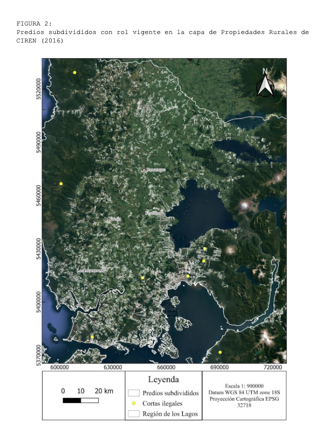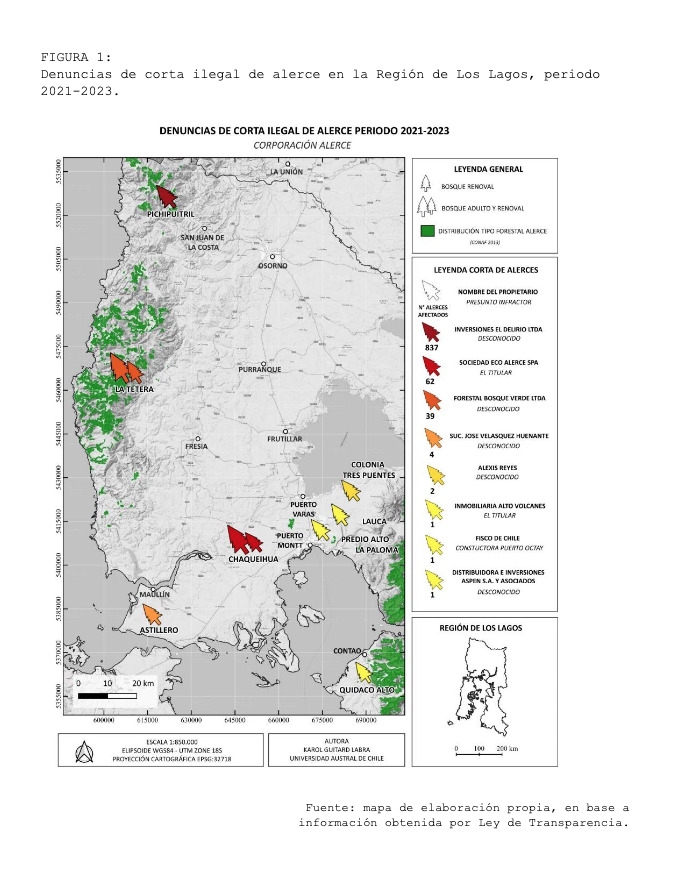 Al analizar los datos de cortas ilegales en la Región de Los Lagos para el periodo 2021-2023 (datos solicitados por transparencia a CONAF; FIGURA 1), llaman fuertemente la atención dos de ellas de carácter grave, pues afectaron árboles grandes probablemente de cientos de años. Una de ellas sucedió en las cercanías del aeropuerto El Tepual, en Puerto Montt, y afectó a 62 alerces. La segunda corresponde a una corta que afectó a 39 alerces, la cual se realizó con fines madereros en el predio de la Forestal Bosque Verde Limitada, en la comuna de Purranque. Además de la corta de árboles adultos se constató una corta ilegal de 837 alerces más pequeños, de los que se desconoce su edad, para habilitar una faja de deslinde predial en la Comuna de San Juan de La Costa. La ubicación de estas cortas se muestra en el mapa de la FIGURA 1.