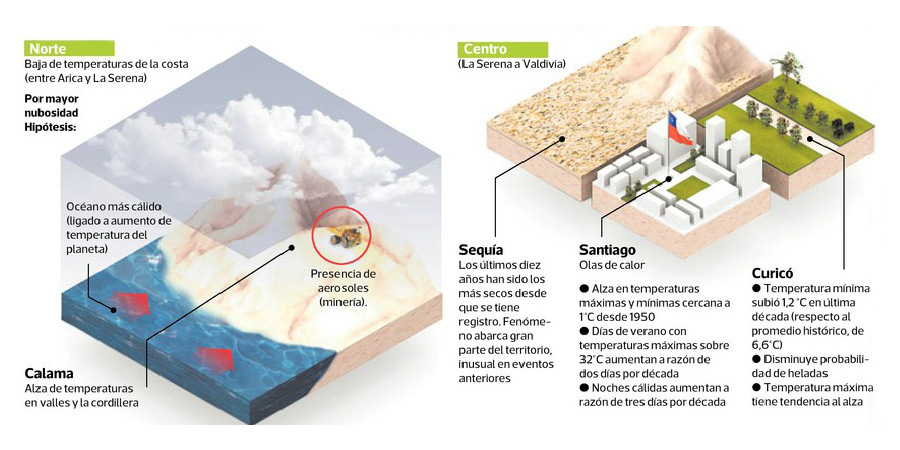 “Hay cambios que son difíciles de atribuir (al cambio climático), pero el alza de la temperatura es lo más evidente. Ya hemos visto que ha aumentado bastante y los informes del IPCC (Panel Intergubernamental sobre el Cambio Climático de la ONU), proyectan dos grados más para Santiago”, dice Pablo Sarricolea, geógrafo de la U. de Chile. Que en Santiago ya haya subido un grado sobre el promedio es claro, dice, y tiene impacto en los días y noches cálidas.