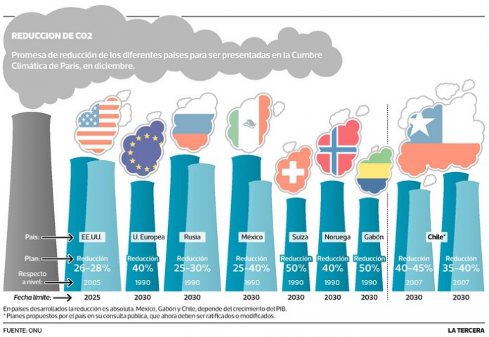 (La Tercera, 02 de abril) El martes finalizó el primer plazo para entregar las metas nacionales para bajar gases de efecto invernadero. EE.UU., la Unión Europea, Suiza, Noruega, Rusia, México y Gabón cumplieron.