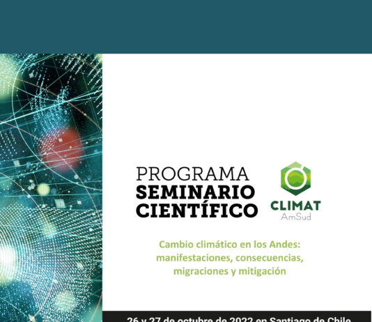 Entre el 26 y el 27 de octubre se realizará el Seminario Científico Regional CLIMAT AmSud, donde nueve científicos y científicas de América del Sur y de Francia expondrán sobre el tema «Cambio climático en los Andes: manifestaciones, consecuencias, migraciones y mitigación».