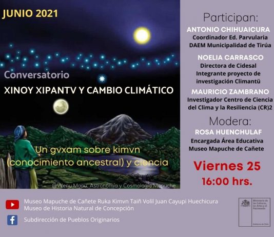El Museo de Historia Natural de Concepción, el Museo Mapuche de Cañete Ruka Kimvn Taiñ Volil Juan Cayupi Huechicura y la Subdirección Nacional de Pueblos Originarios del Ministerio de las Culturas, las Artes y el Patrimonio, tienen el agrado de invitar al Conversatorio "Xinoy xipantv y cambio climático".