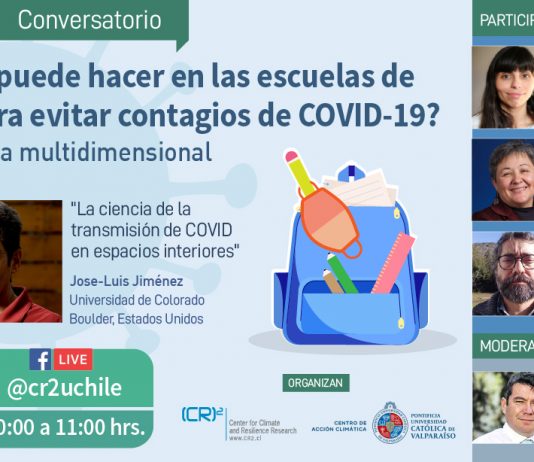 El Centro de Ciencia del Clima y la Resiliencia (CR)2 y el Centro de Acción Climática de la Pontifica Universidad Católica de Valparaíso tienen el agrado de invitar al Conversatorio Online "¿Qué se puede hacer en las escuelas de Chile para evitar contagios de COVID-19? Una mirada multidimensional".