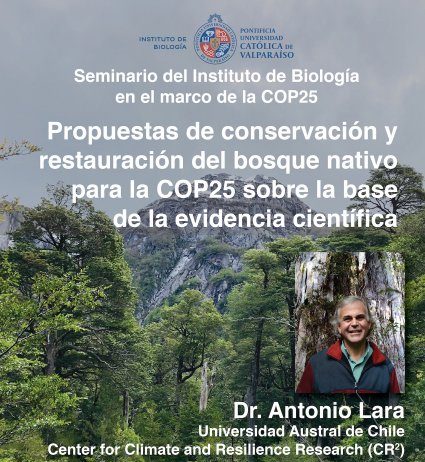 El Instituto de Biología de la Pontificia Universidad Católica de Valparaíso, invita al seminario “Propuestas de conservación y restauración del bosque nativo para la COP25 sobre la base de la evidencia científica”, dictado por Antonio Lara, investigador principal de la Línea de Cambio de Uso de Suelo del (CR)2...