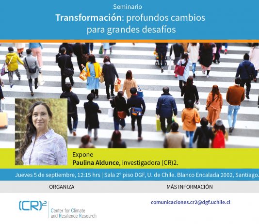Centro de Ciencia del Clima y la Resiliencia (CR)2, invita a paraticipar del seminario "Transformación: profundos cambios para grandes desafíos", que será dictado por Paulina Aldunce, investigadora del (CR)2 y académica de la Facultad de Ciencias Agronómicas de la Universidad de Chile