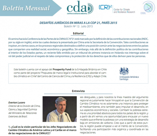 Edición de julio de 2015 del boletín “Desafíos jurídicos en miras a la COP 21, París 2015″, preparado por el equipo jurídico de la línea Dimensión Humana del (CR)2. En esta oportunidad, presentamos la entrevista a Everton Lucero, Director de la División de Clima, Ozono y Seguridad Química del Ministerio de...