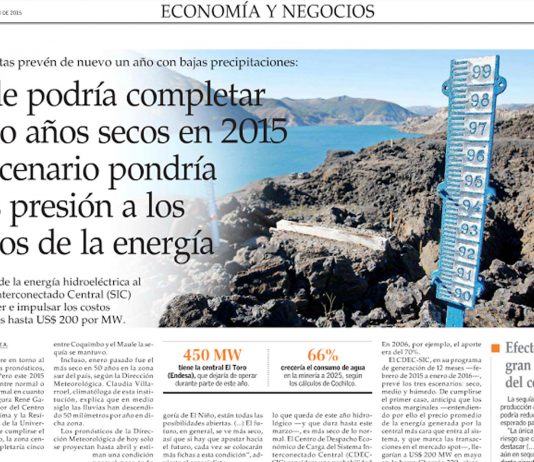 (El Mercurio, 26 de febrero) El aporte de la energía hidroeléctrica al Sistema Interconectado Central (SIC) podría caer e impulsar costos marginales hasta US$200 por MW.