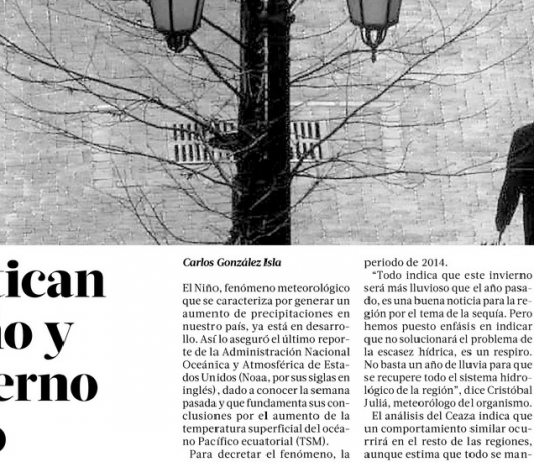 (La Tercera, 10 de marzo) Después que el Noaa confirmara la llegada de El Niño, expertos vaticinan que lloverá más que en 2014, aunque en rangos históricos promedios.