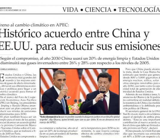 (La Tercera, 13 de nov) China y EE.UU., los dos mayores contaminantes del planeta, anunciaron ayer, por primera vez, medidas conjuntas para reducir emisiones, un acuerdo, que sin embargo, no gustó a muchos sectores republicanos en Norteamérica.