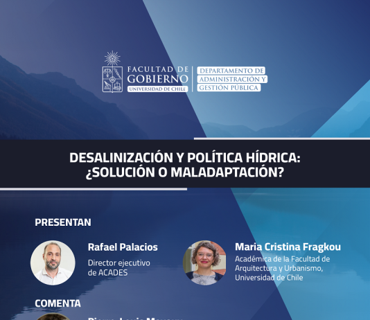 En el marco del Proyecto FONDECYT 1220048, el Departamento de Administración y Gestión Pública de la Facultad de Gobierno de la Universidad de Chile, invita a la Conferencia “Desalinización y política hídrica: ¿solución o maladaptación?” en la que se presentarán Rafael Palacios, Director Ejecutivo de ACADES y María Cristina...