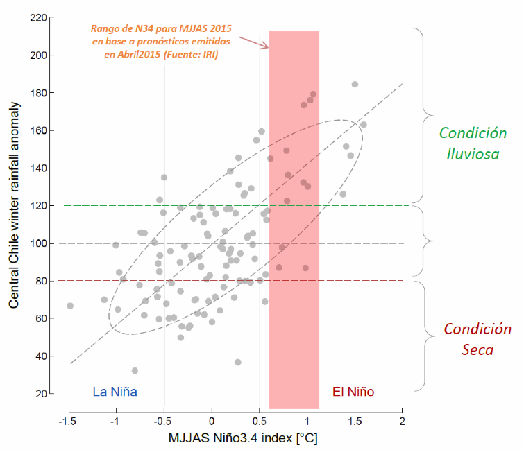 En comparación con el otoño del 2014, las actuales condiciones en el Pacífico ecuatorial son más propicias al desarrollo de un evento de El Niño, el primero en más de 10 años. Históricamente, estos eventos producen precipitaciones invernales en el rango promedio a lluvioso sobre Chile central. Sin embargo, tal relación debe ser tomada con cautela pues la historia cambia rápidamente.
